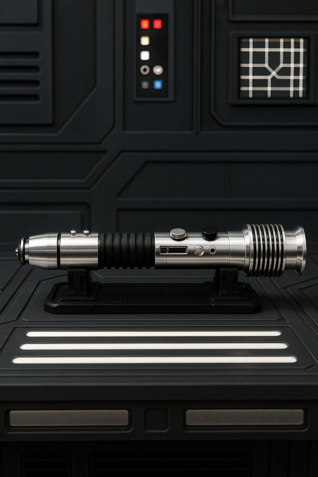 Really well-designed chassis with neat, metal details. Weathering adds a nice touch and matches the weathered Ascension saber well. Also added longer screws that better secure the chassis into the hilt.